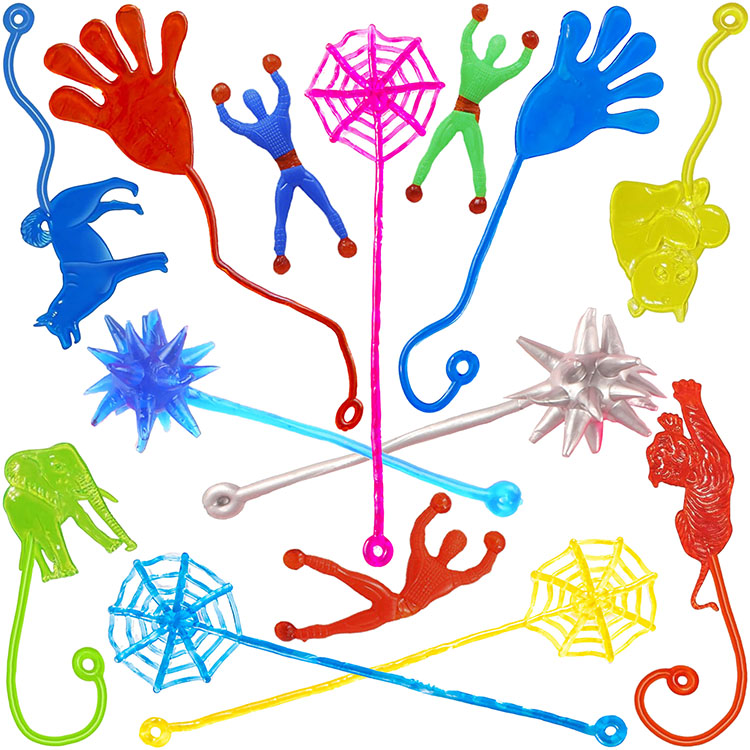 This mix includes most classic sticky toys such as sticky animals, hands, hammers, webs and wall-climbers.